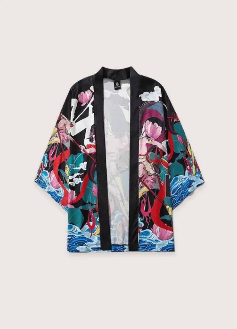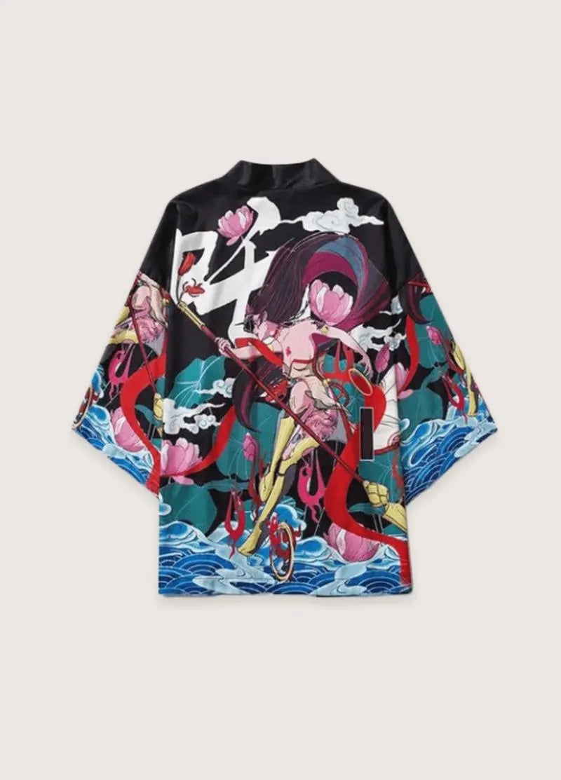 Découvrez ce kimono japonais Édition Prestige illustrant une femme samouraï armée d'un long bâton, entourée de fleurs de lotus et de vagues bleues. Sur fond noir, les couleurs rouge, vert, rose et bleu créent une composition saisissante qui rend hommage aux guerrières japonaises.