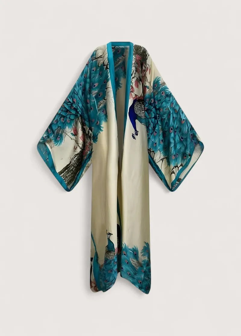 Le kimono japonais en soie femme bleu capture l'essence de l'océan pacifique dans un vêtement d'exception. Confectionné en imitation soie-satin de qualité muséale, ce haori moderne allie tradition millénaire et innovation textile contemporaine. Les motifs de paon turquoise évoquent les vagues stylisées de l'art ukiyo-e, transformant cette robe japonaise en hommage vivant à la culture nippone.