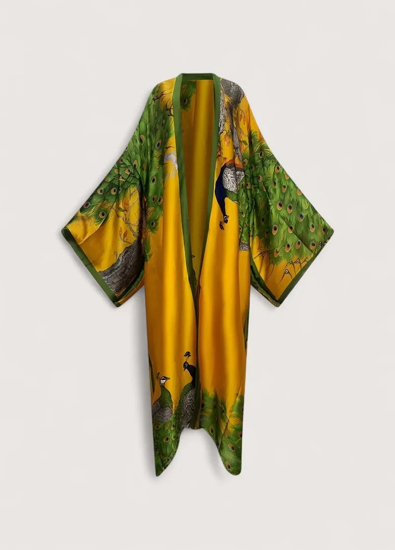 Le kimono mousseline de soie femme vert orange célèbre l'harmonie parfaite entre terre et soleil dans un vêtement d'exception. Cette création en imitation mousseline polyester révèle toute la sophistication textile japonaise adaptée aux goûts contemporains. Les motifs de paon irisés se parent de teintes végétales qui évoquent les jardins zen traditionnels, transformant cette robe asiatique en véritable poème vestimentaire.