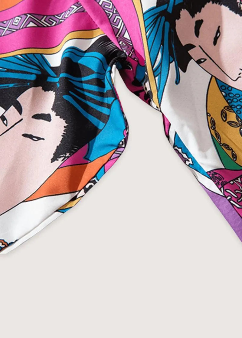 Découvrez ce kimono japonais urban style aux motifs géométriques modernes mêlant figures traditionnelles et design contemporain. Les teintes turquoise, rose vif, orange, violet et jaune sur fond blanc créent un pont audacieux entre l'art manga et la tradition. Parfait pour un look streetwear original.