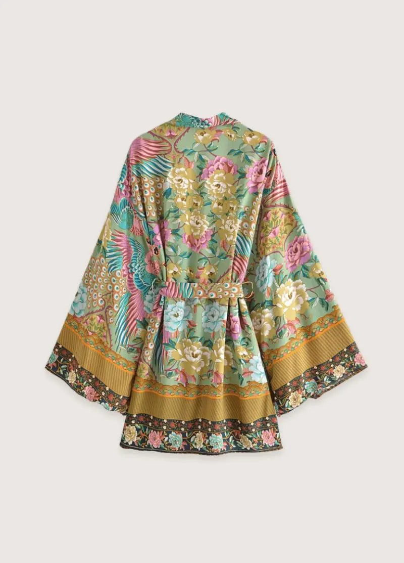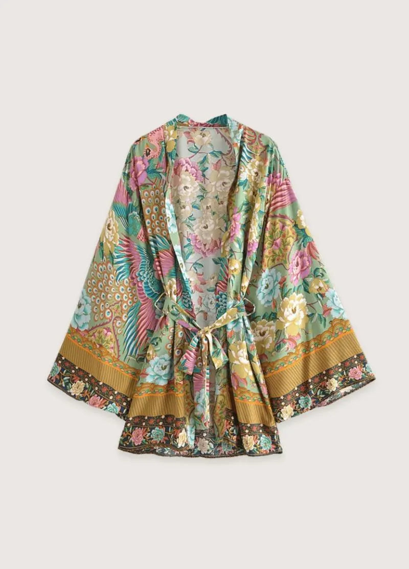 Paréo fleuri court pour plage : kimono paon aux motifs exotiques
