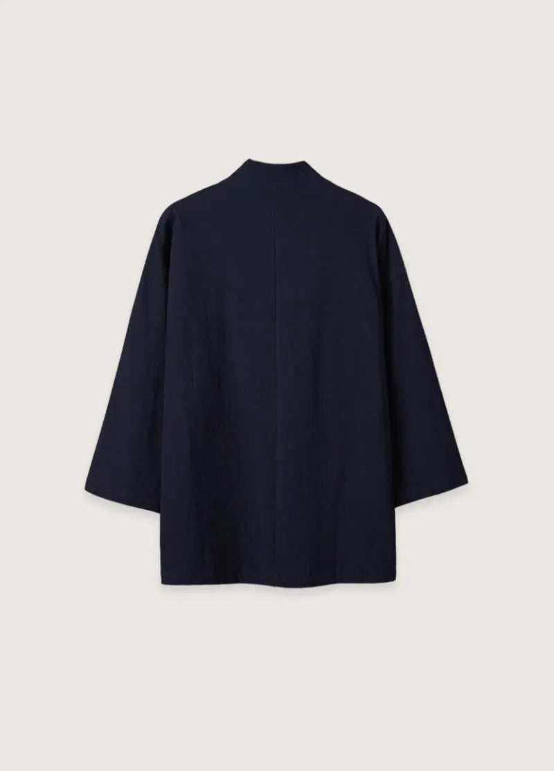 La confection artisanale de ce kimono court révèle un savoir-faire ancestral adapté aux exigences modernes. Deux poches discrètes intégrées avec subtilité offrent une fonctionnalité pratique sans compromettre la pureté des lignes minimalistes. Disponible en bleu marine profond et bleu nuit, cette surchemise décontractée transcende les saisons grâce à son tissu respirant et sa polyvalence stylistique. Les finitions soignées témoignent d'une attention méticuleuse portée à chaque détail, garantissant durabilité et élégance intemporelle.