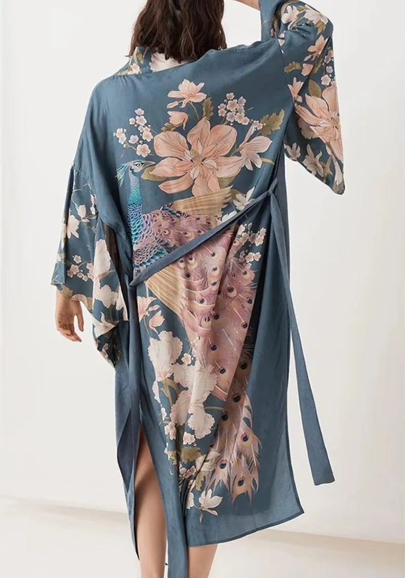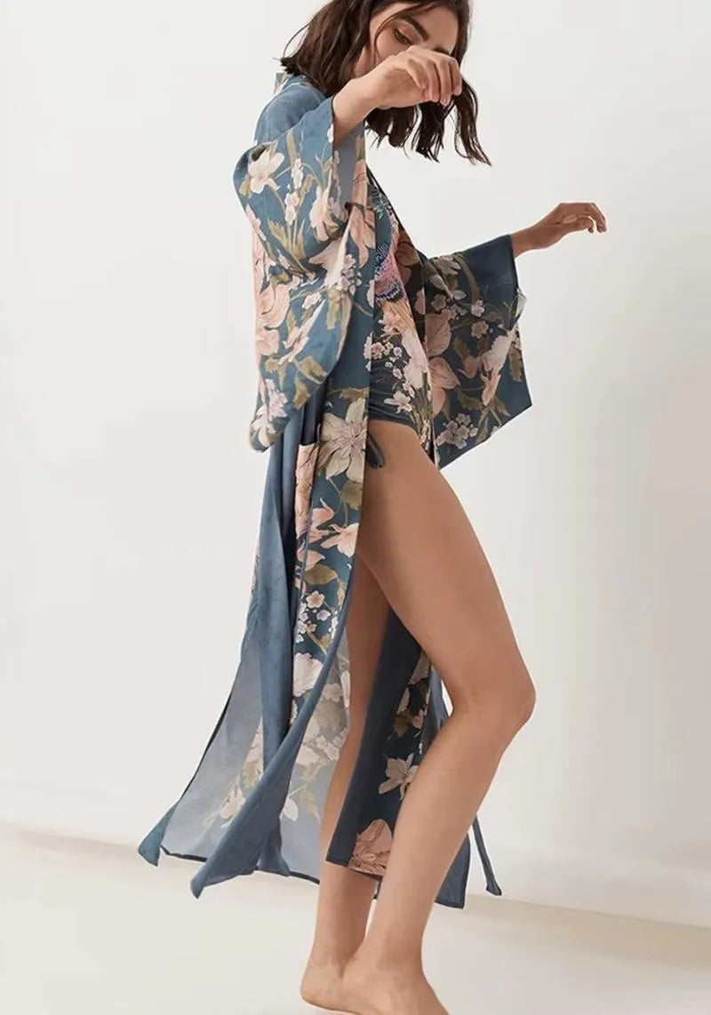 Kimono bleu long fleuri pour femme - Élégance japonaise authentique