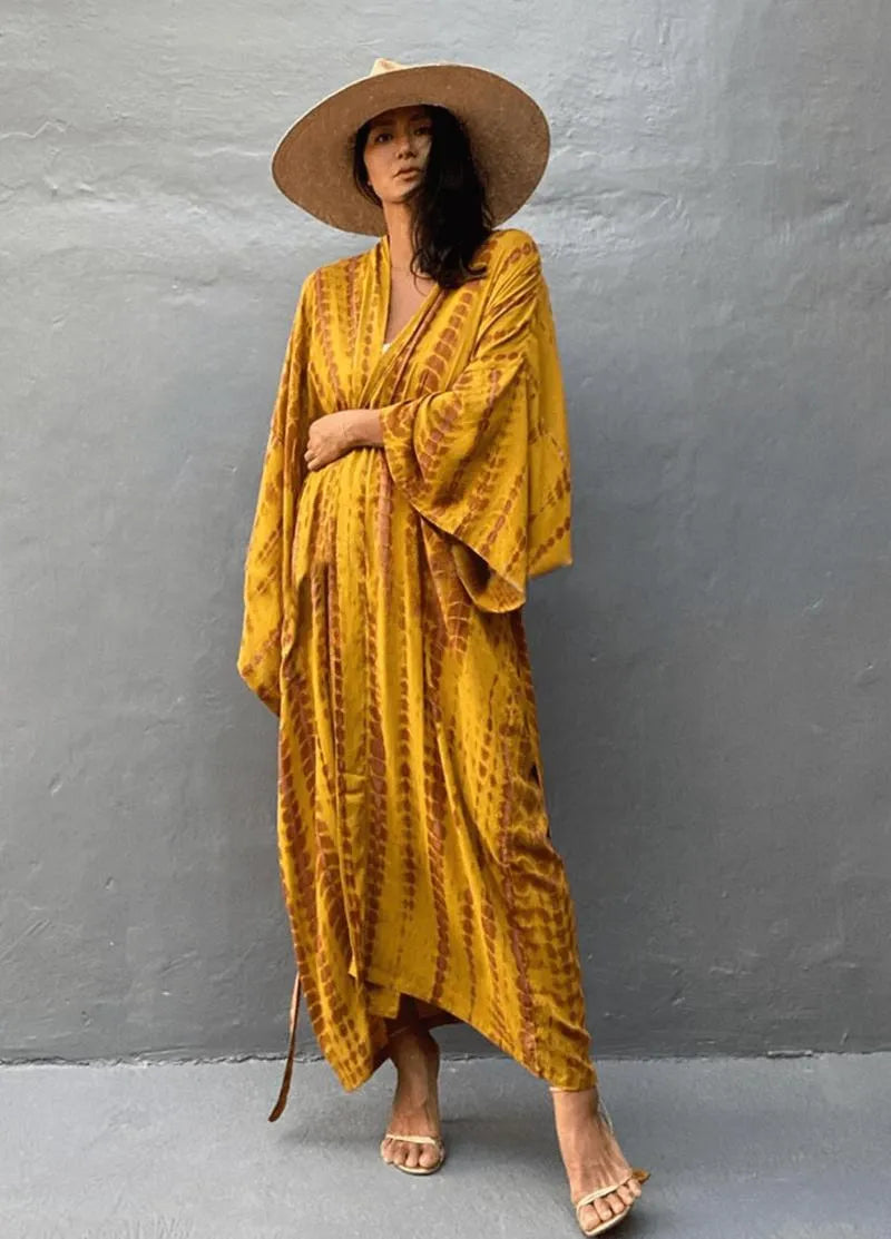 Découvrez notre magnifique kimono jaune moutarde long pour femme aux reflets dorés