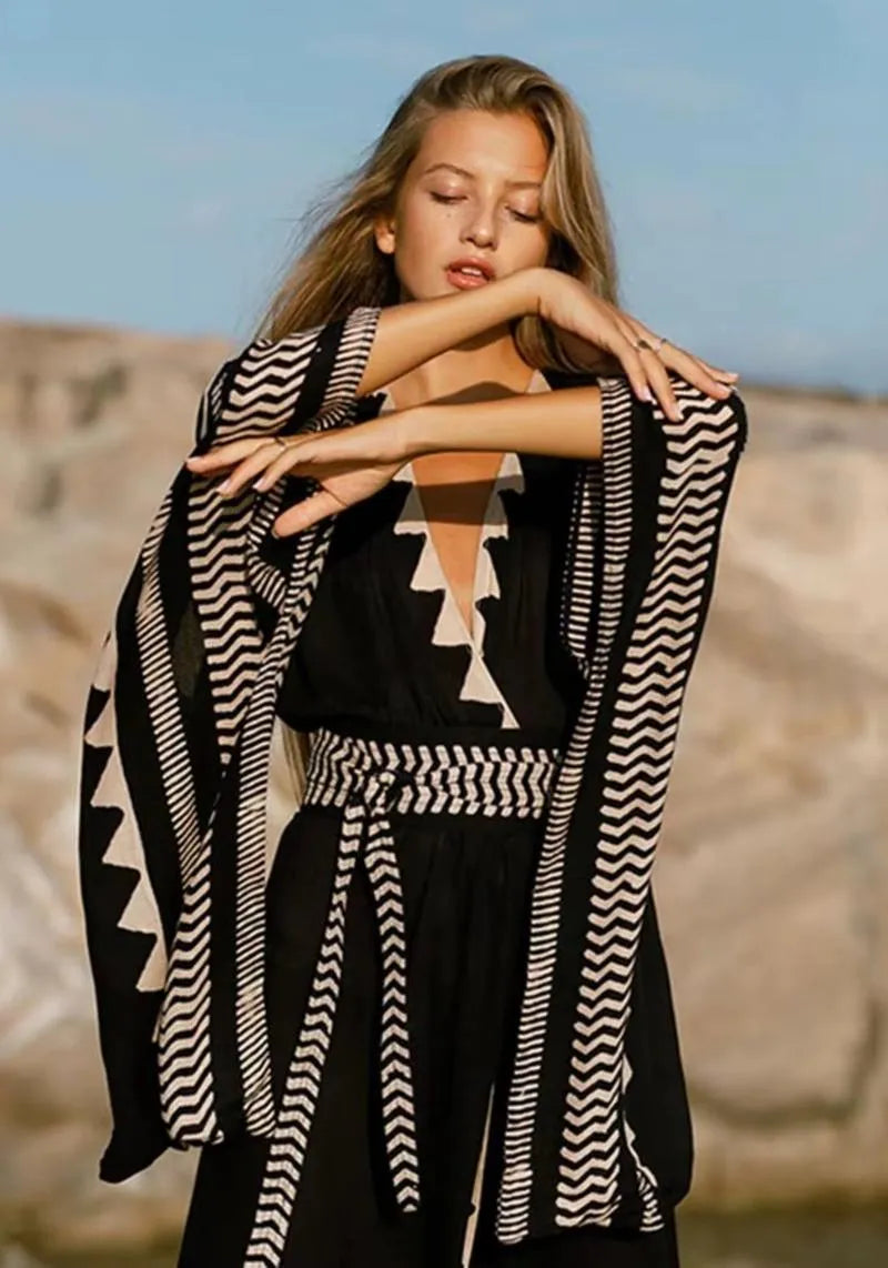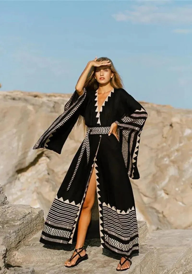 Ce kimono long noir incarne l'art vestimentaire japonais dans sa plus pure expression. Confectionné dans un tissu fluide de qualité supérieure, il révèle des motifs géométriques contrastants en blanc cassé qui subliment sa teinte profonde. Cette pièce exceptionnelle transforme chaque silhouette en véritable œuvre d'art vivante.