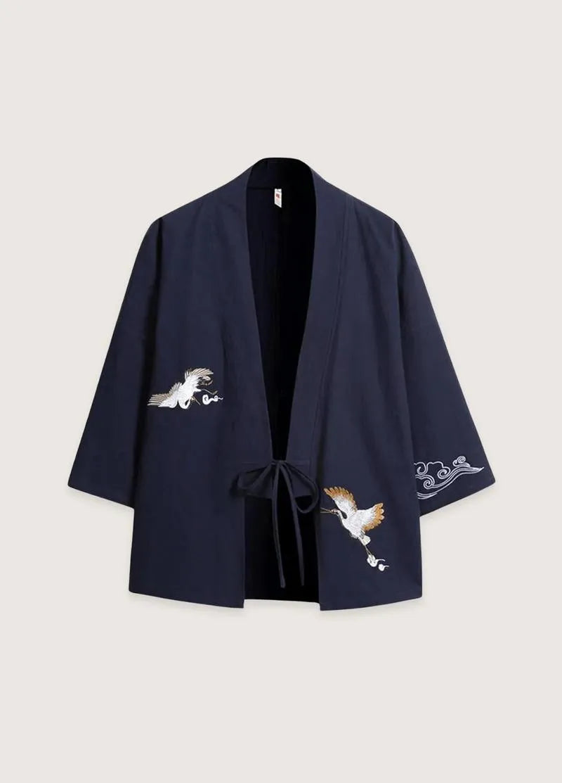 Ce kimono veste homme bleu marine en lin incarne l'essence même de l'élégance décontractée japonaise. Conçu dans un tissu de lin naturel d'une douceur exceptionnelle, ce haori traditionnel révèle des broderies minutieuses de grues et nuages qui témoignent d'un savoir-faire ancestral. Sa teinte bleue profonde apporte une sophistication naturelle à votre garde-robe masculine, transformant instantanément n'importe quelle tenue en statement de style raffiné.